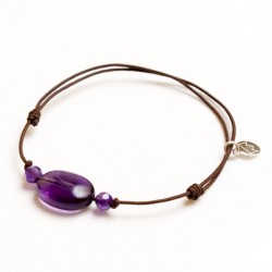Bracelet cordon marron ajustable à noeuds coulissants et fermoir argent, avec une améthyste taillée en galet, deux petits critaux de roche facettés, et un pendant argent massif. Taille enfant (à partir de 2 ans) et adulte.