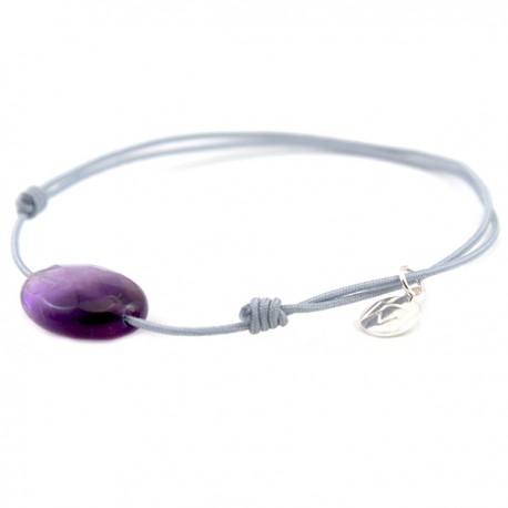 Bracelet cordon gris ajustable à noeuds coulissants avec une améthyste taillée en galet facettée et un pendant rond court ou long en argent massif. L'anneau du pendant est soudé pour la longue tenue et la sécurité des enfants.