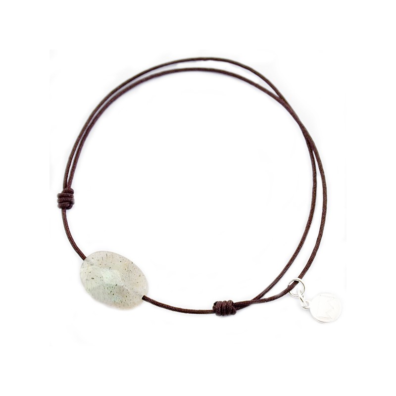 Bracelet cordon marron ajustable à noeuds coulissants avec une Labradorite ( voir reflet en bas de page) taillée en galet facettée et un pendant rond court ou long en argent massif. L'anneau du pendant est soudé pour la longue tenue et la sécurité des enfants.